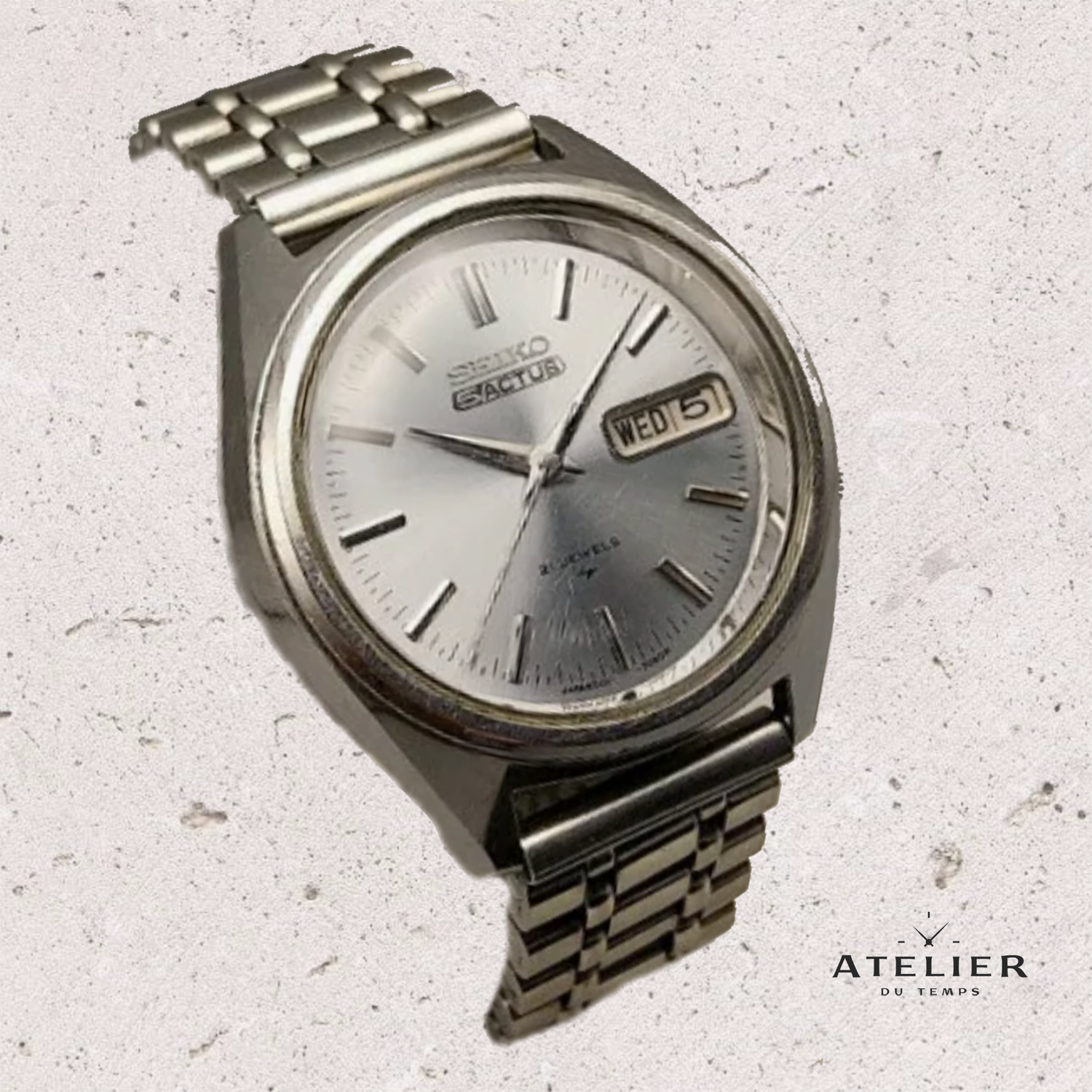 Een vintage horloge, geproduceerd door Seiko in de jaren '70. Het model valt op door zijn elegante, minimalistische ontwerp en werd gepositioneerd als een middelklasse horloge binnen Seiko’s line-up.